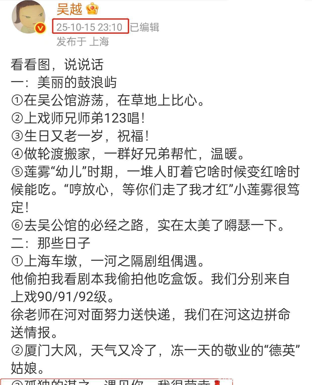 吴越在剧组过53岁生日!被陈建斌抛弃后单身至今,不婚不育也幸福 4月10号的生日,吴越愣是拖到10月15号才发庆生照,跟个小姑娘似的碎碎念着,说和朋友一起过的,有好看的风景陪着,还打趣自己跟演的角色快融为一体了。 其实这时间选得特有意思,生日当天她正在《沉默的荣耀》剧组拍戏,发照片的时候刚好是剧要大结局,她演的朱枫牺牲那阵儿。一句“孤独的谌之,遇见你,我很荣幸”,把对角色的喜欢、尊重和不舍全倒出来了,那些碎碎念里也全是对生活的热乎劲儿。
